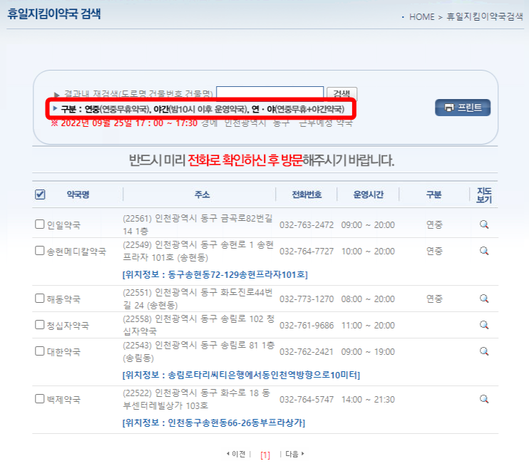 검색이 완료되면 아래와 같이 해당 지역의 날짜와 시간에 운영하는 약국목록이 나타납니다.