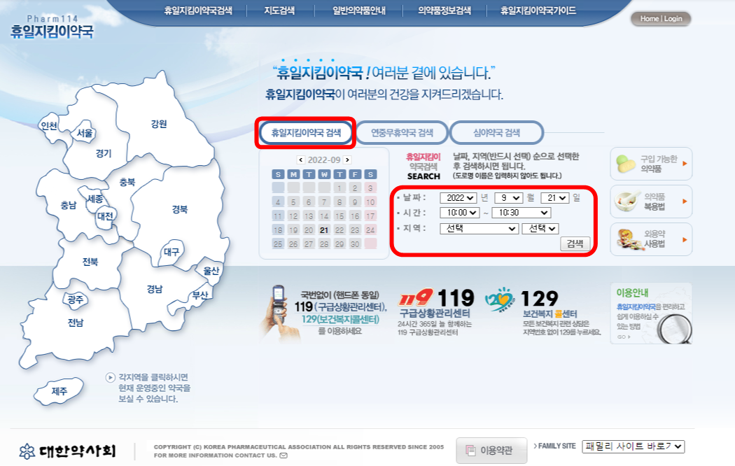 대한약사회에서는 '휴일지킴이약국' 사이트를 운영하고 있는데요.