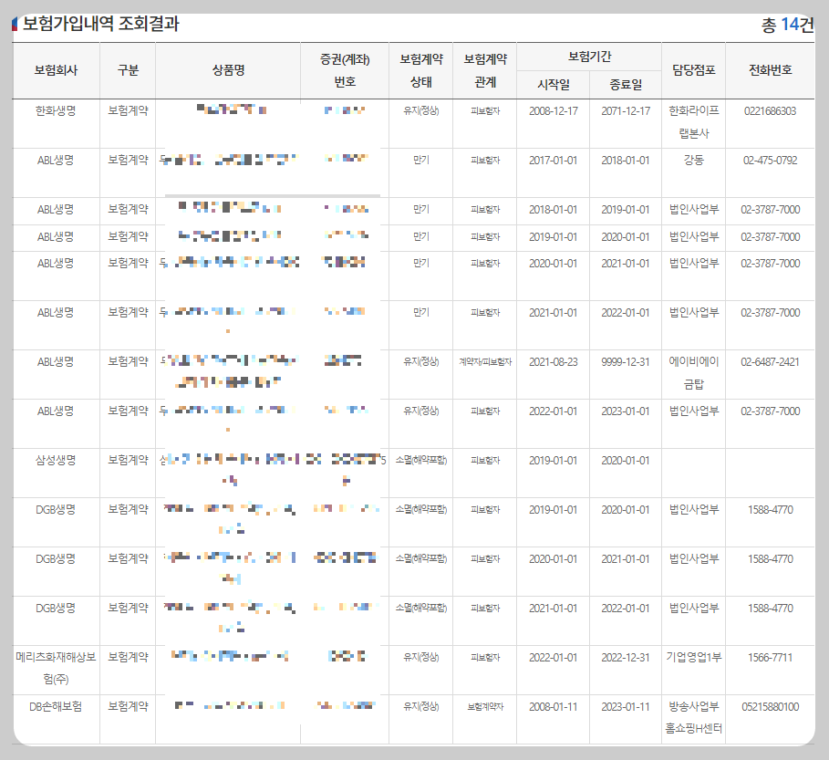 5. 조회가 끝나면 아래와 같이 보험가입내역이 나타납니다. 보험회사, 상품명, 보험기간 등 대략적인 정보들이 나타나고 현재 유지중인 보험 뿐만아니라 만기되거나 소멸(해약)된 보험 내역까지 나타납니다. 기억이 안나는 보험은 여기서 한번에 다 찾을수 있네요.