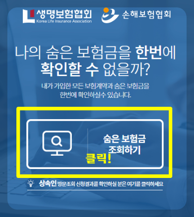 1. 위 링크로 접속하시면 아래와 같은 메인 화면이 나타납니다. 가운데 숨은보험금 조회하기 클릭해주세요.