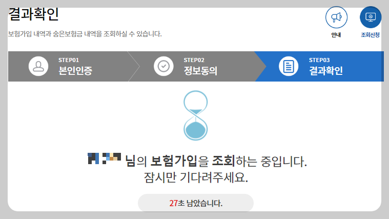4. 개인정보 이용수집 동의하시면 아래와 같이 조회중이라는 화면이 나타납니다. 최대 30초까지 시간이 소요되니 조금만 기다려 주세요.